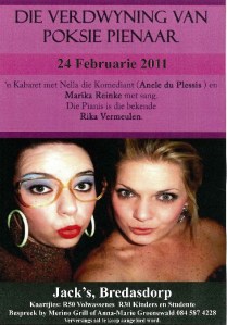 Eerste moet ek 100 kaartjies verkoop- voor Donderdag! Die kabaret “Die verdwyning van Poksie Pienaar is DONDERDAGal hier- ek het nog net 2 verkoop…. Dit gaan mooi wees, en kos net R50 , dus kan julle bloggers tog assebliefie elkeen een koop- of die geld stuur vir my vir liefdadigheid…..