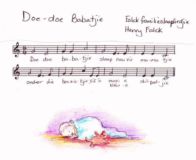 Maar nouja, met 12 kinders in die huis, was daar seker vir ‘n baie lang ruk altyd babatjies in die huis. Met julle ouma tweede oudste en Oom Henry net ‘n entjie jonger as sy, veronderstel ek dat hulle baie keer babatjies aan die slaap moes sing. En toe maak oom Henry hierdie liedjie.