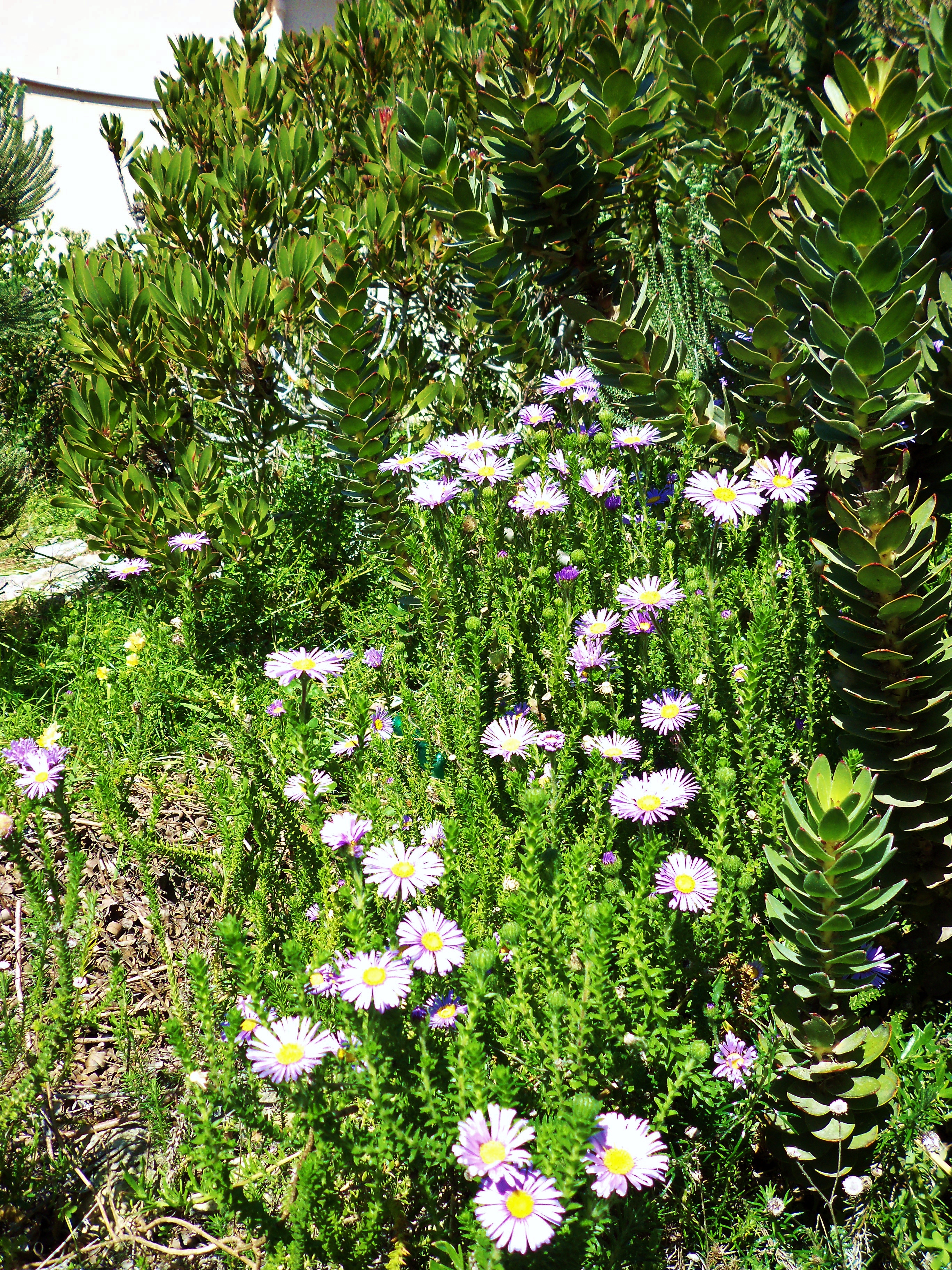 Olga, weet jy, hulle is nie eintlik pers nie, hulle is potblou! Ek dink ‘n mens noem dit blou felicias of so-iets.(Toooorts!!!!! Help!!!!!) Die 3de foto is ‘n bietjie oor belig, maar hulle is pers met ‘n geel senter, en sulke kliphare egte fynbos blaartjies. Hulle blom feitlik die hele jaar, vanaf so Maart-April, tot amper somer. ‘n Mens kry ‘n goudgeel een ook, maar om een of ander rede is die geles skaars in my tuin. Ek sal die gele ‘n bietjie moet gaan aanhelp.