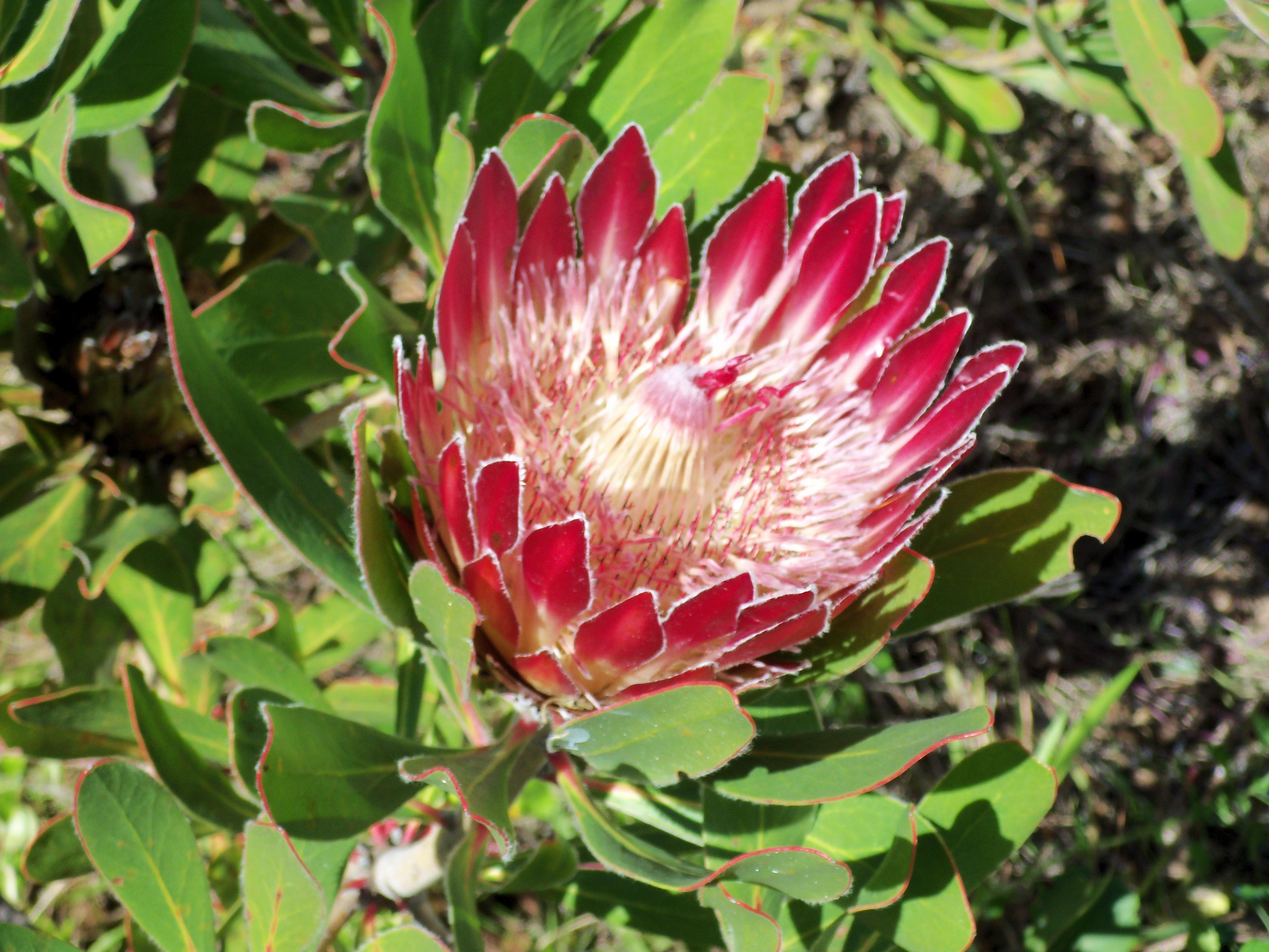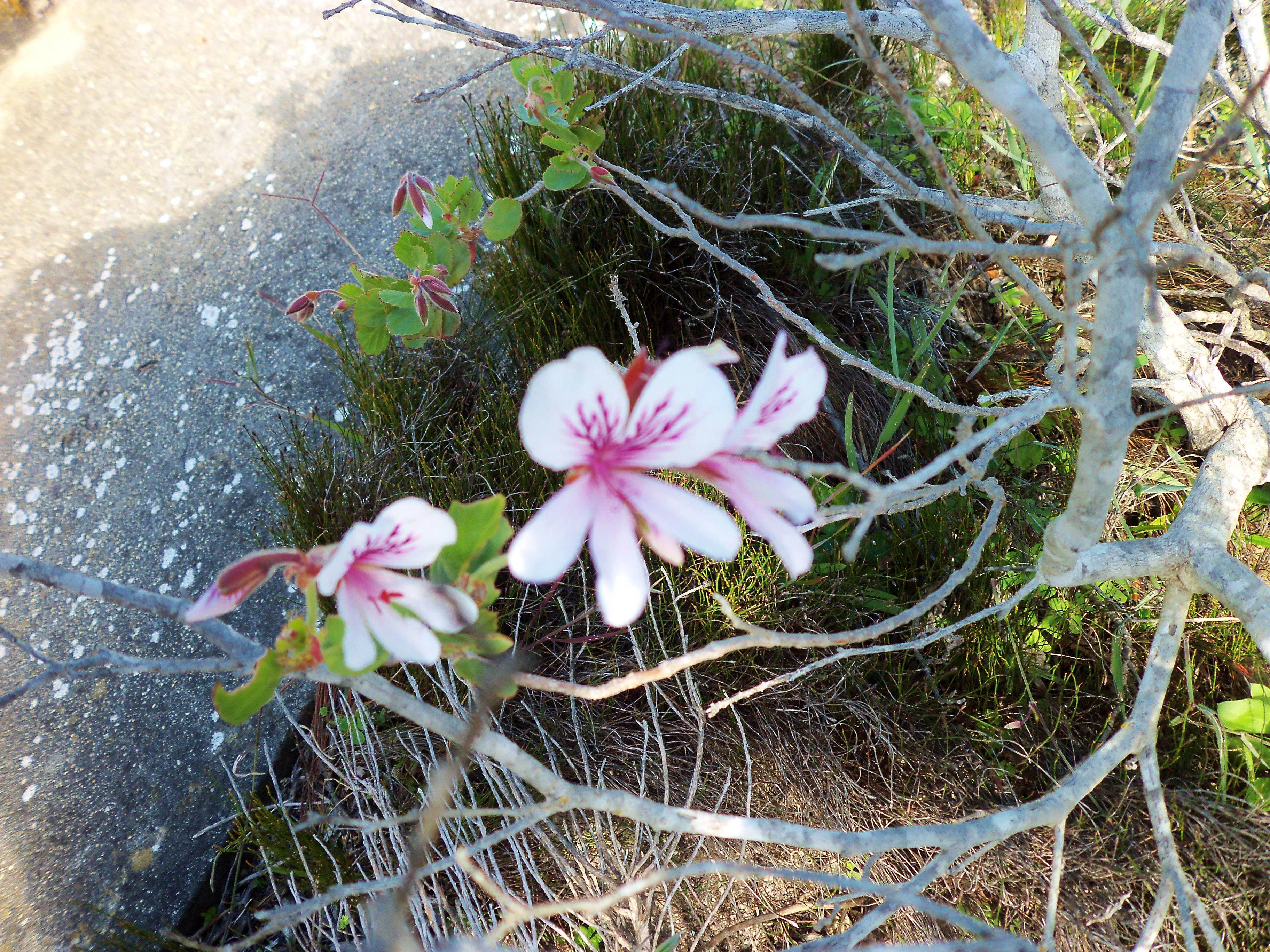 Reg, die eerste geel blommetjies is freezias, wat oral sommer wild opkom, ook op ‘n mens se grasperk. Dan is daar die felicia of blou magrietjie. Hy maak nie saans toe nie, in teenstelling met die volgende ligpers blommetjie wat saans toemaak. Ek sal sy naam soek. Dan is daar ‘n geel fynbosblommetjie en die wilde malva( wit met ligienk binne) en dan die Struisbaai protea, moenie my se wetenskaplike naam vra nie, maar my ma het gedink dis sommer die ‘common” protea, terwykl ek weer mal oor hom is, omdat hy so ‘n helder rooi is. Die compacta groei ook hiet, minder as 400m vgan ons erf af, maar verseg om 400 tree nader aan die see te groei