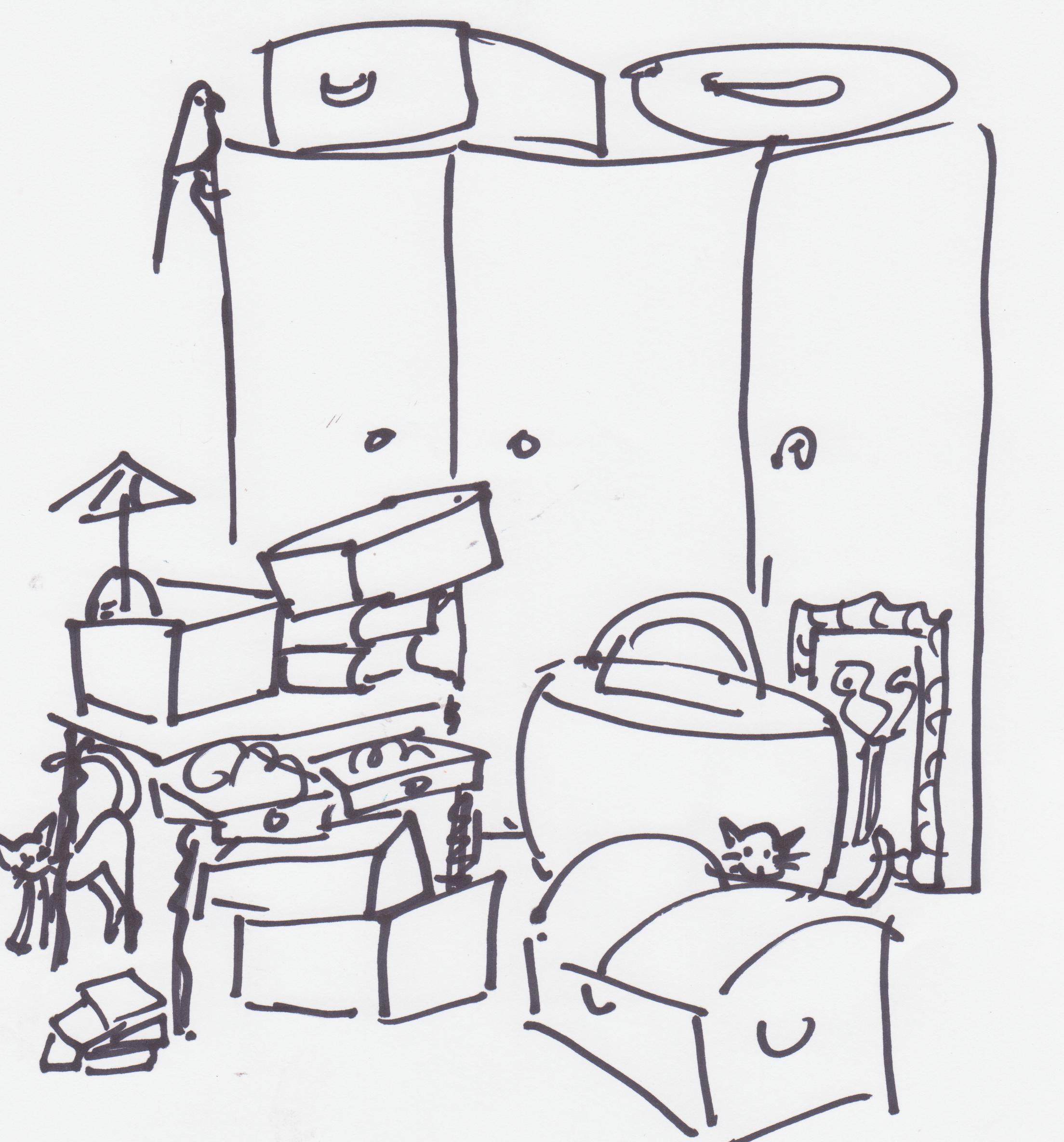Hier is bokse, daar  is sakke, die kas moet uitgepak raak, daardie een in, waarheen gaan hierdie laaikas, waarheen die bed, ag nee die prente moet af, waarheen waarheen waar waar en hoe? eina my rug nee, nie daar nie, daar!
