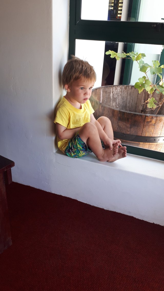 Hier is die laaste foto wat ek geneem het. Ek stuur dit in vir die “photo challenge ” wat ek by Toorts gesien het. Die kleine seuntjie sit diep en dink in die vensterbank van ‘n wynboetiek terwyl sy ouers n wynproe bywoon. Die foto is onveranderd geplaas. Ek is geen fotograaf nie, maar dit was vir my mooi.