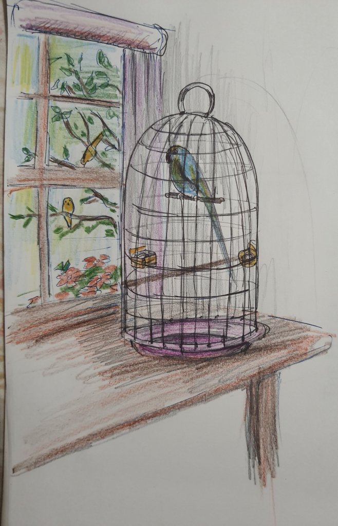 Pragtige skets en ek stem saam – voëls hoort nie in hokkies nie.