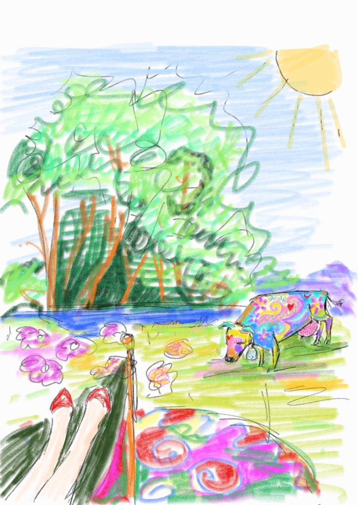 Net toe is daar n onaardse lawaai en iets stamp my dat ek daar trek- ek eenkant toe en die verfblikke anderkant toe . Dis ‘n hele swetterjoel hondjies en katte, ‘n lemur, ‘n klein seekoeitjie en wat nog en wat nog wat mekaar rondjaag en my uit die aarde gehardloop het. Ek sit plat op my sitvlak , verfspatsels op my klere en gesig, maar voor my staan die vreemdste gedierte – pienk, blou rooi en geel. Dis Blommetjiie, Kameel se koei wat , net so niksvermoedend soos ek, vreedsaam net langs my stoepie staan en wei het en nou ‘n instant make-over gekry het.